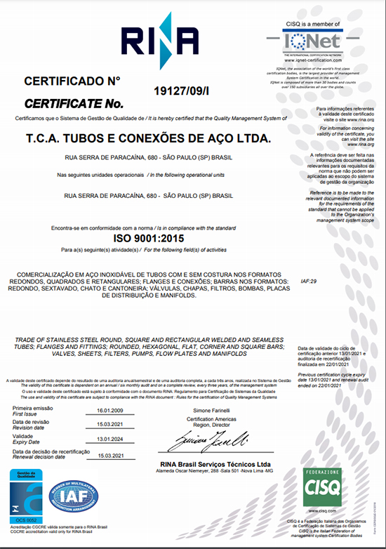 A TCA – Tubos e Conexões de Aço LTDA, através de seu Sistema de Gestão da Qualidade, tem como objetivo a melhoria contínua de seus produtos, processos e serviços, visando a satisfação de seus clientes, motivando seus funcionários e parceiros e respeitando o meio ambiente.
